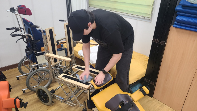 하계 가정돌봄기간 동안 이용인 휠체어 점검을 하는 시간을 가졌습니다.